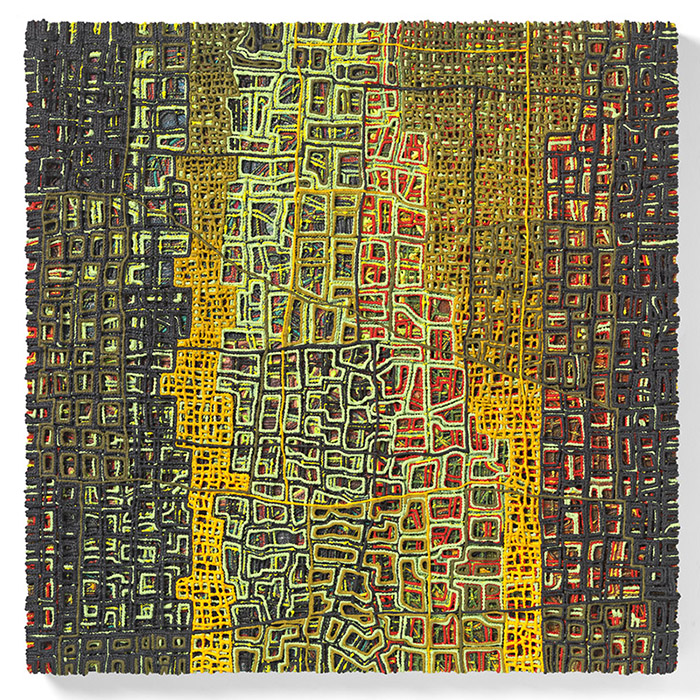 20 x 20 x 2", fabric, acrylic pigment, acrylic medium, 2015 (Collection of New England Biolabs)